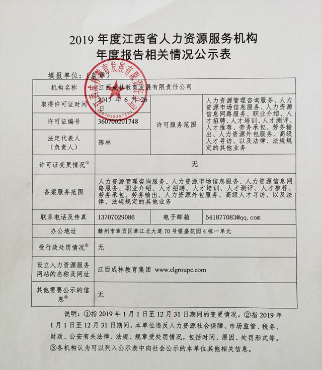 2019年度江西省人力资源服务机构年度报告相关情况公示表